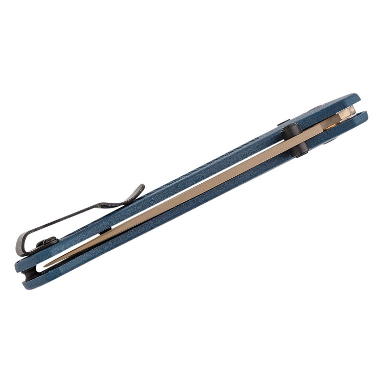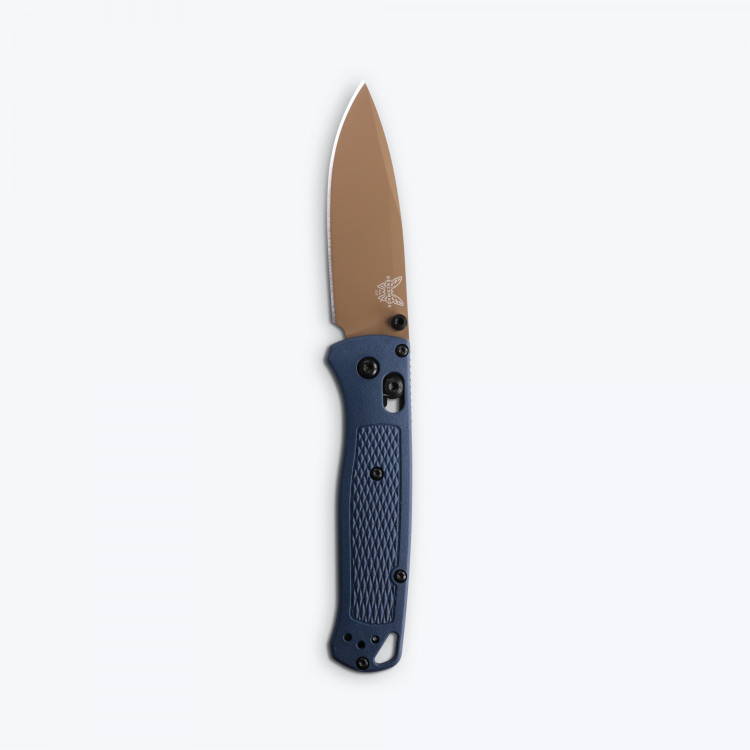 Розкриття ножа проводиться за допомогою двостороннього анодованого в блакитний колір шпенька, а надійну фіксацію забезпечує розроблений і запатентований компанією Benchmade замок AXIS. Зручна рукоять блакитного кольору з полімеру Grivory здатна витримувати високі температури і має велику міцність. Плашки текстуровані для кращого захоплення при роботі. Крім того, ніж буде зручний як правші, так і лівшам, тому що виробник дає можливість переставляти кліпсу. Як доповнення в підставі рукоятки розташоване досить великий отвір для темляка.