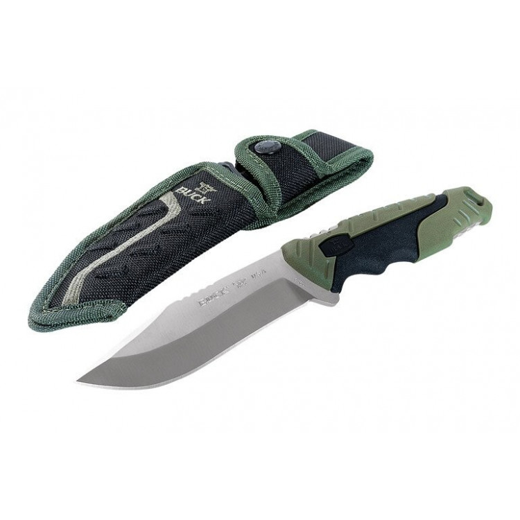 Buck Pursuit Large 656GRS - практичний мисливський ніж. Бак приділив тут велику увагу функціональності. Ручка зроблена з комбінації FRN (нейлону, армованого скловолокном) і Versaflex. Обидва пластика, кожен з яких має свої унікальні особливості, об'єднані в цій ручці. Гнучкість Versaflex і міцність FRN. Лезо виготовлено зі сталі 420HC. Міцна нержавіюча сталь, яка добре себе зарекомендувала завдяки чудовій термообробці Пола Боса.