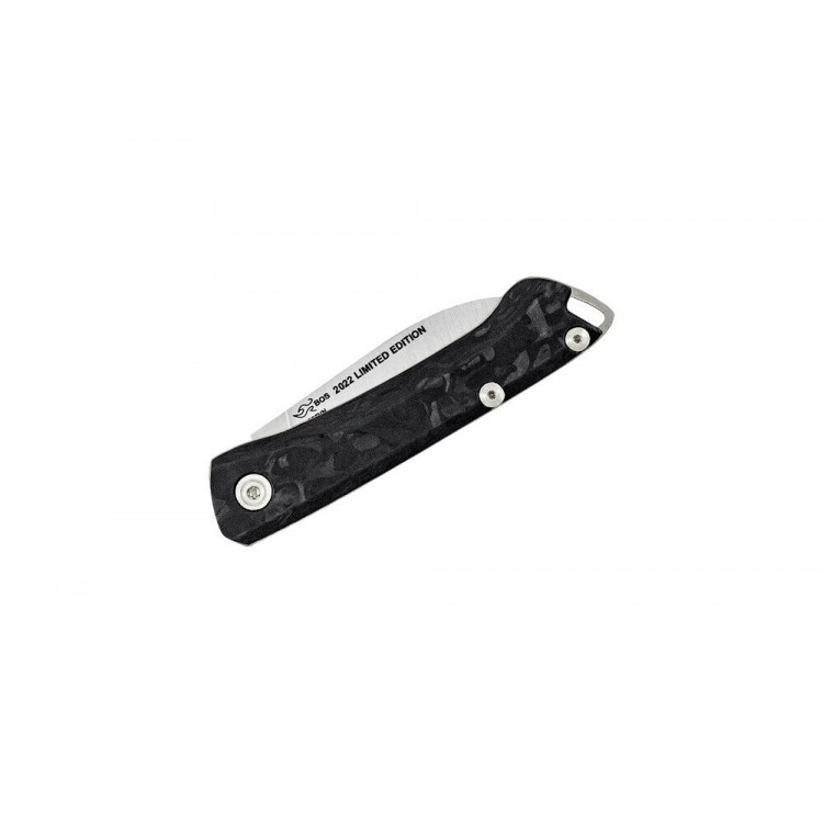 В рамках колекції Legacy 2022 250 Saunter являє собою нову модель з традиційним замком типу slip joint. Виготовлений із сучасних матеріалів, цей складаний ніж має повністю плоский сатинований клинок із преміальної сталі S35VN та рукоятку із вуглецевого волокна з мармуровим візерунком. Ніж поставляється зі шкіряним чохлом.