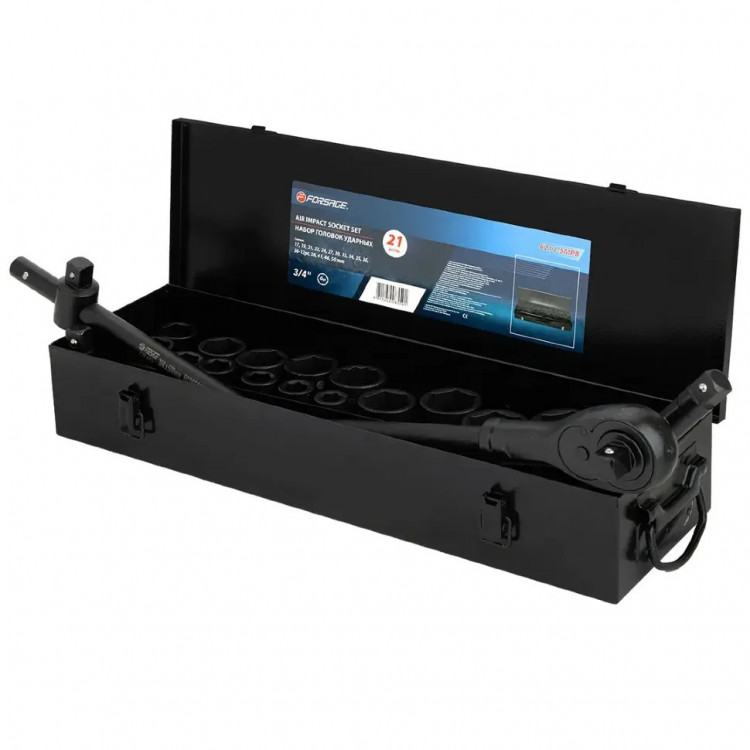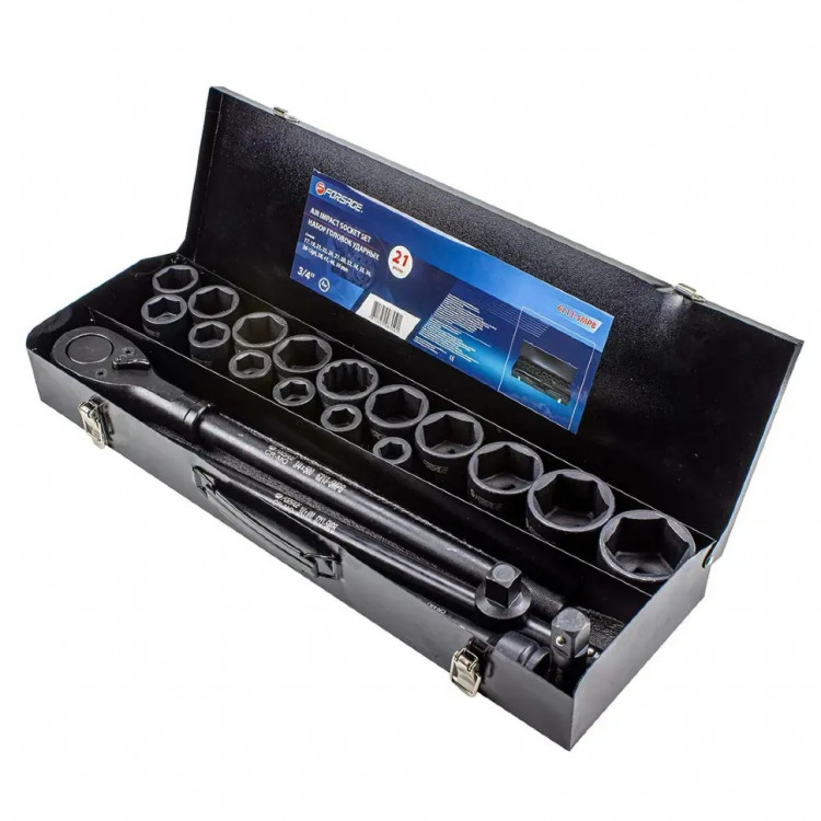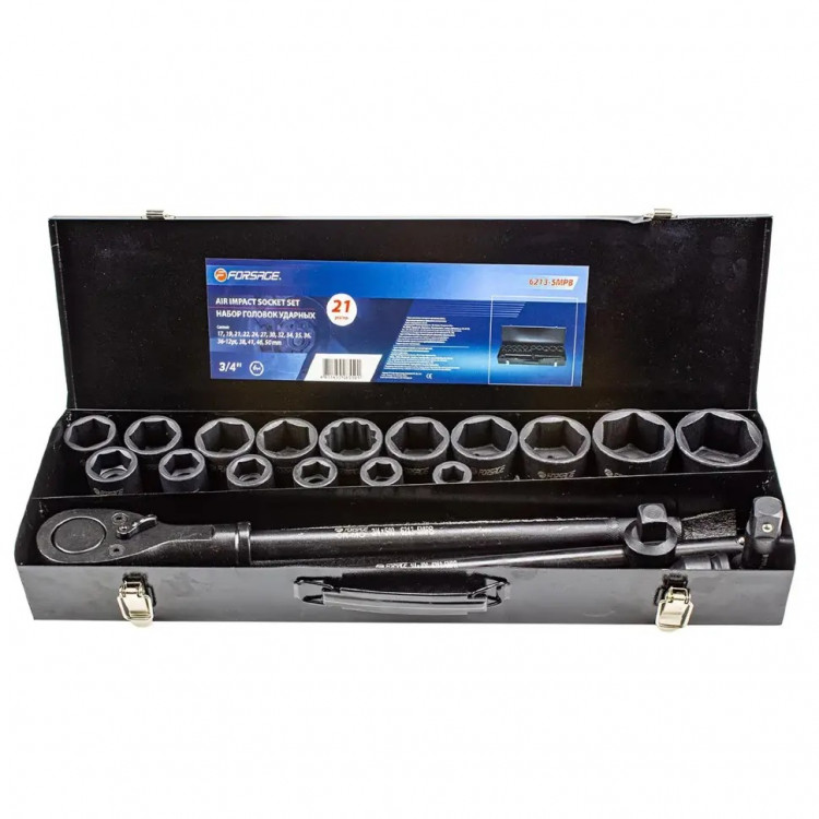 - Універсальність головок: Комплект включає широкий діапазон 6-гранних ударних головок 3/4" (від 17 мм до 50 мм), а також одну 12-гранну головку на 36 мм. Це дозволяє працювати з різними розмірами кріплення, розширюючи сферу застосування набору.