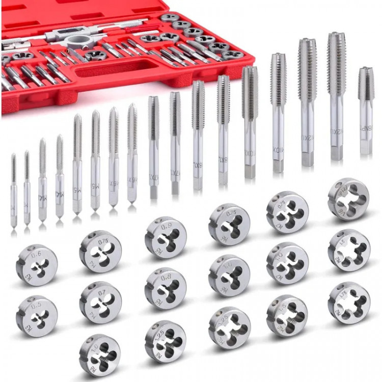 Мітчики дозволяють точно нарізати внутрішнє різьблення, а плашки — зовнішнє. Інструмент виготовлений із міцної інструментальної сталі, що забезпечує довговічність та надійність використання. Набір укомплектований усім необхідним для зручної та точної роботи.