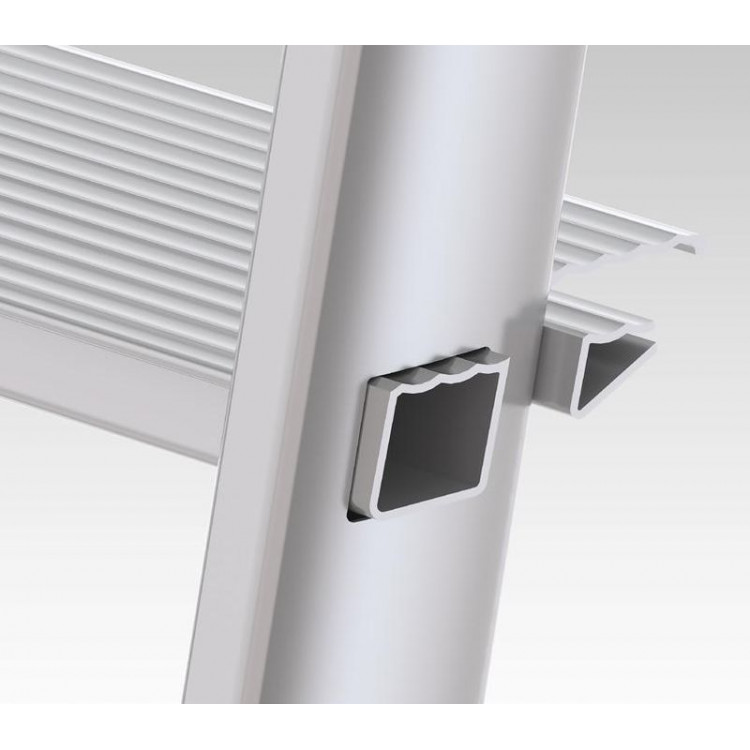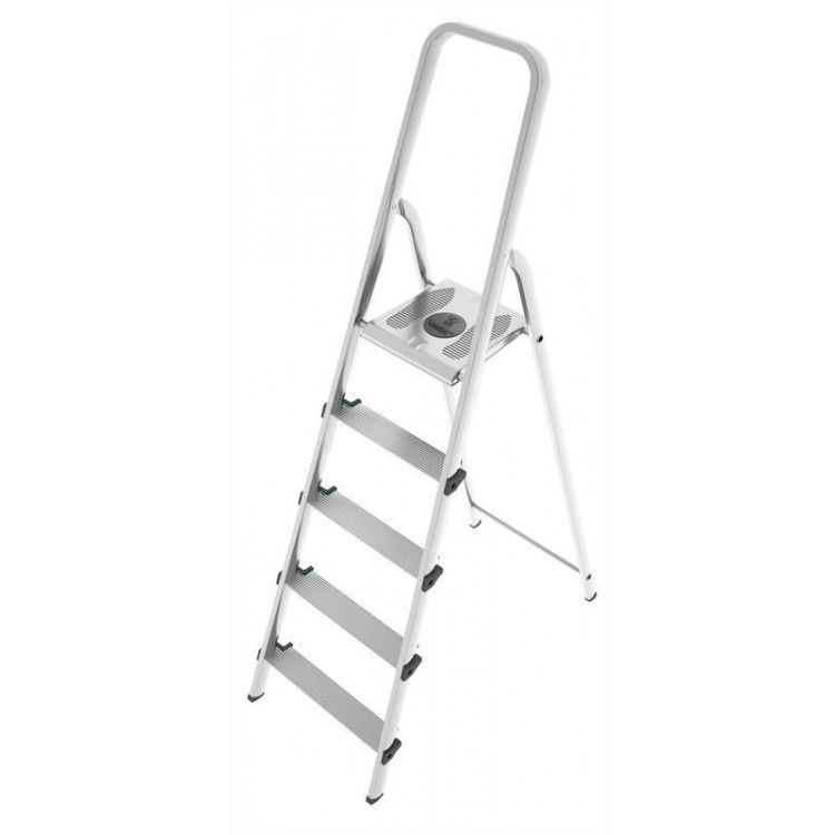 Драбина Colombo Stark 5 щаблів (S109005W) - міцна, універсальна, легка, безпечна. Сертифікована відповідно до європейського стандарту якості EN131. Максимальне навантаження - 150 кг. Модель рекомендована як для професійного, так і для домашнього використання. Драбина обладнана захистом від випадкового складання. Драбина має п ять щаблів з антиковзною структурою. Опорні ніжки мають пластиковий захист, який перешкоджає небажаному ковзанню. З цією драбиною ви можете працювати на висоті до 3,06 метри. За рахунок того,що основа виготовлена зі сталі,а щаблі з алюмінію, виріб міцний і надійний.