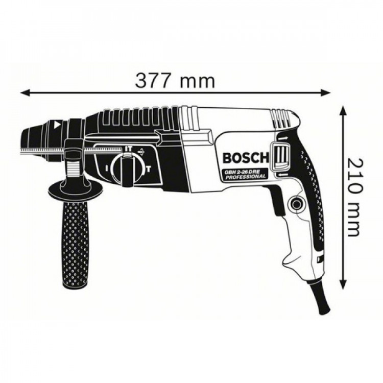 - GBH 2-26 DRE відрізняється компактними розмірами (83х377х210 мм) і невеликою вагою (2,8 кг). Додаткова рукоятка ергономічної формою має спеціальне м'яке покриття, яке істотно знижує вібрації.