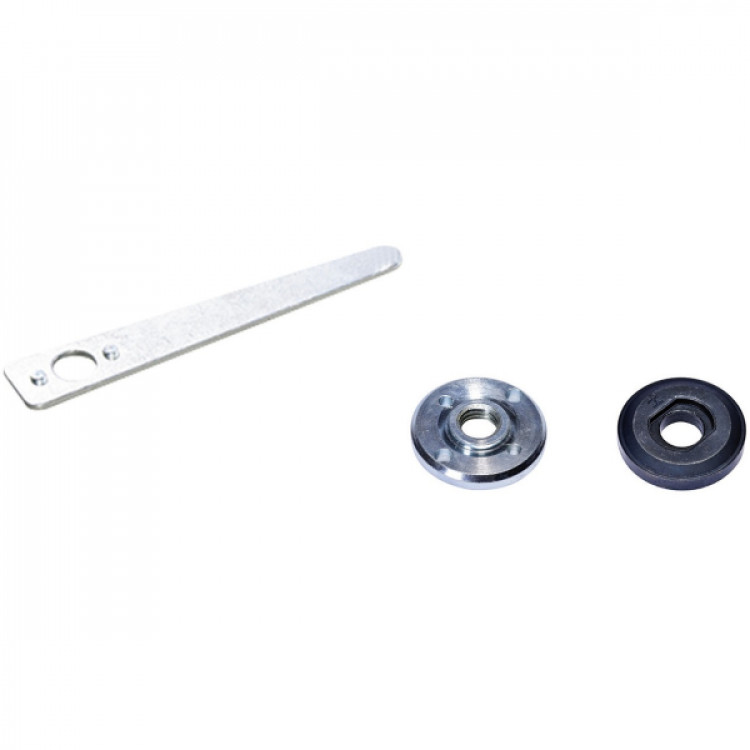- У комплекті цього артикулу, крім шліфувальної машини, ви знайдете: захисний кожух, ключ під два отвори, затискну гайку, додаткове руків'я та кріпильний фланець.
