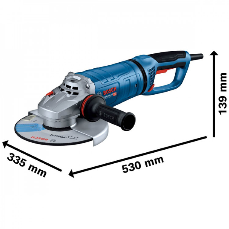 - Болгарка Bosch GWS 27-230 JR Professional розрахована на роботу від стандартної електромережі з напругою 230В і оснащена потужним електродвигуном номінальною споживаною потужністю 2700 Вт, що забезпечує високий запас продуктивності для інтенсивних професійних завдань.