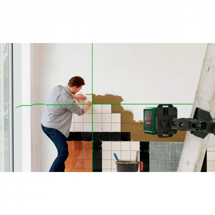 Bosch Quigo Green виставляє 2 зелених промені на відстані 12 м за 6 с. У комплекті зі штативом