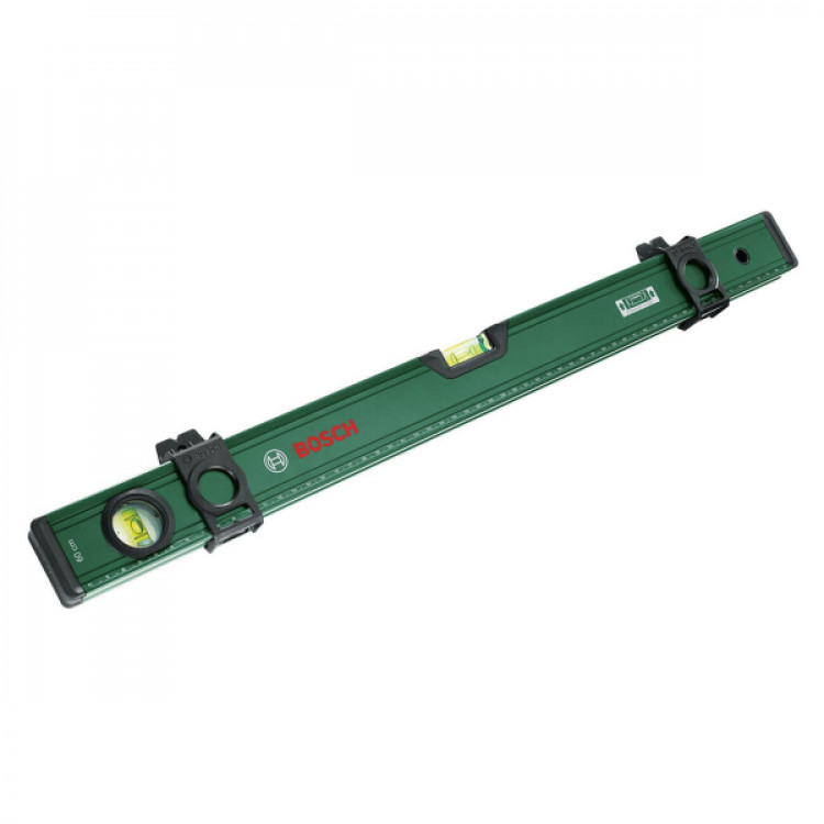 Великий і зручний спиртовий бульбашковий рівень Bosch побутового класу з довжиною 60 см з маркувальними повзунками для зручності розмітки. Має двосторонню метричну шкалу 0-57 см і 2х0-28 см, точність позиціонування до 0.5 мм/м. Є 2 капсули, корпус алюмінієвий, V-подібний паз для розміщення на округлих предметах. Прогумовані заглушки на торцях.
