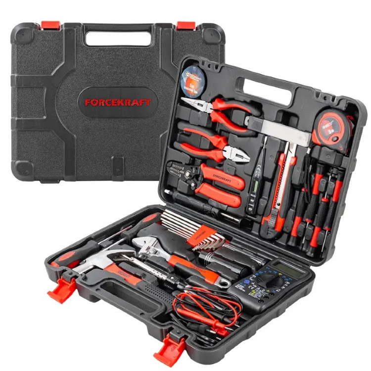 Набір інструментів FORCEKRAFT на 34 предмети FK-1034— ідеальне рішення для проведення слюсарних та монтажних робіт у гаражі, на дачі чи вдома. Якість виготовлення: Інструменти виконані з хромованадієвої сталі з нікель-хромовим покриттям, що забезпечує їхню міцність, стійкість до зносу та тривалий термін служби. Універсальність: Набір містить усе необхідне для різних завдань: від робіт з електричними ланцюгами та дрібного ремонту до слюсарних та монтажних робіт. Мобільність і компактність: Мультиметр та індикаторна викрутка допоможуть усунути неполадки в електропроводці, пасатижі та розвідний ключ — при роботі з кріпленням, паяльник — для пайки проводів і з’єднань. Компактний ліхтар забезпечує додаткове освітлення у слабоосвітлених місцях, рулетка, молоток-гвоздодер та ножі з лезами додають зручності та функціональності. Усі інструменти розміщені в міцному та зручному пластиковому кейсі для транспортування. Завдяки продуманій організації, ви завжди швидко знайдете потрібний інструмент. Комплектація: Ізоляційна стрічка Пасатижі 2 шт. Щипці для зняття ізоляції Індикаторна викрутка Ніж Леза для ножа 5 шт. Рулетка Викрутки для точних робіт 4 шт. Інструмент для видалення припою Викрутки 2 шт. Ключі 6-гранні, Г-подібні 8 шт. Припій Розвідний ключ Мультиметр Паяльник Молоток-гвоздодер Ліхтар Кейс