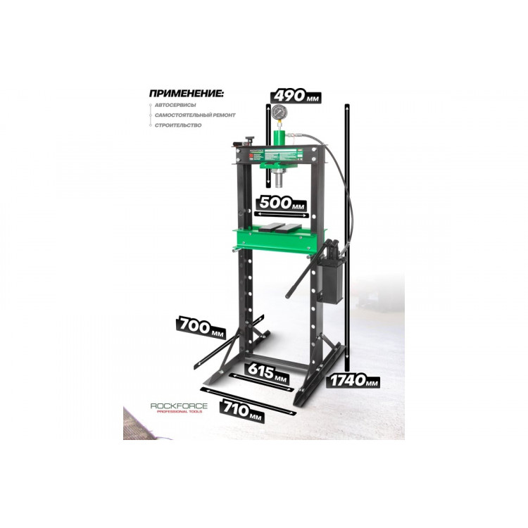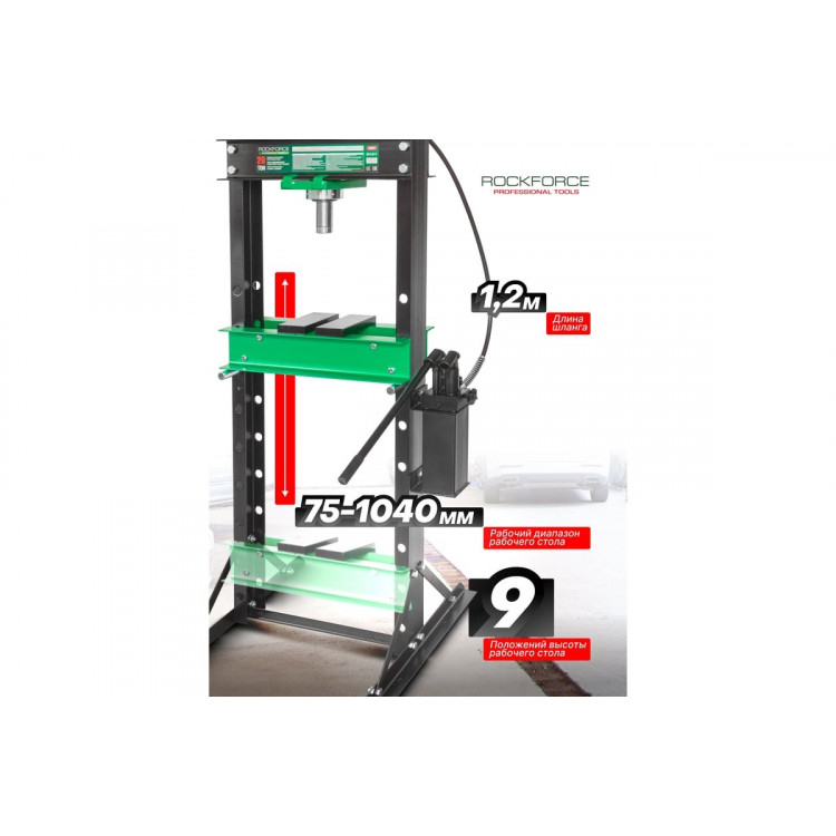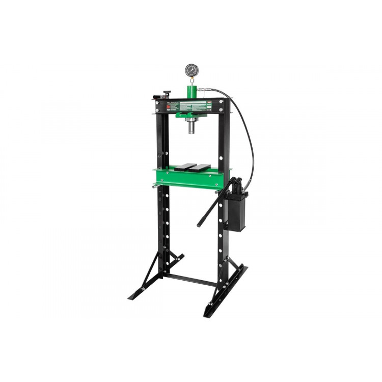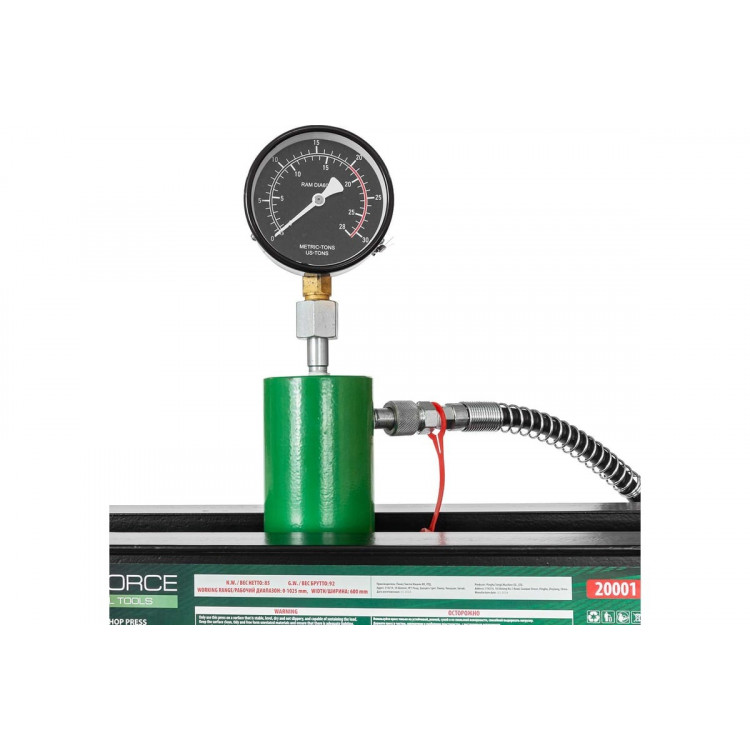 Прес гідравлічний 20т напольний з подвійним виносним насосом (швидко/повільно), (роб. в-а: 0-1025ММ) RF-20001Прес оснащений функцією подвійного насоса, яка дозволяє штоку швидко наближатися до деталі за допомогою одного насоса, а потім без зусиль прикладати зусилля в 20 тонн з іншим. Простим поворотом ручки внутрішня зворотна пружина автоматично піднімає плунжер від деталі, і роботу завершено!Це важливе доповнення для будь-якого спеціаліста з ремонту автомобілів. Він може використовуватися для пресування, формування та гибки.Цей прес може похвастатися робочим діапазоном 0-1020 мм. Робочу постіль можна відрегулювати в 8 положеннях, тому ви можете легко встановити її в потрібному положенні. Макс. вантажопідйомність 20 тонн.Каркас високої якості в поєднанні з перевіреною сталлю забезпечує безвідмовну роботу протягом багатьох років.Цей прес для майстерень оснащений легко читаним манометром, що показує тиск у тоннах, що дозволяє легко розраховувати значення тиску в будь-який час.