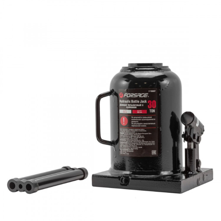 Гідравлічний домкрат Forsage з клапаном безпеки призначений для підйому вантажу масою до 30 тонн.Домкрат є незамінним інструментом в автосервісі, часто використовується під час проведення ремонтно-будівельних робіт.Мінімальна висота підхоплення домкрата Forsage становить 23 см.Максимальна висота, на яку домкрат може підняти вантаж, становить 36 см.Цієї висоти достатньо для встановлення жорсткої опори під піднятий вантаж і проведення ремонтних робіт.Клапан безпеки запобігає підйому вантажу, маса якого перевищує масу заявлену виробником.Також домкрат оснащений магнітним збирачем, що унеможливлює наявність стружки в маслі циліндра, що значно скорочує ризик поломки домкрата.Основа зроблена зі сталі. УВАГА!Домкрат не призначений для тривалого підтримування вантажу у висячому положенні або для його переміщення.Перед підйомом переконайтеся, що вантаж розподілений рівномірно по центру опорної поверхні домкрата.Маса вантажу, що піднімається, не повинна перевищувати масу, зазначену виробником.Домкрат під час роботи має бути встановлений на горизонтальній рівній і твердій поверхні.Після підняття вантажу необхідно використовувати спеціальні стійки-підставки для його підтримування.Забороняється проводити будь-якого виду роботи під піднятим вантажем за відсутності підставок, що його підтримують.Перед початком роботи ознайомтеся з інструкцією з експлуатації виробу.