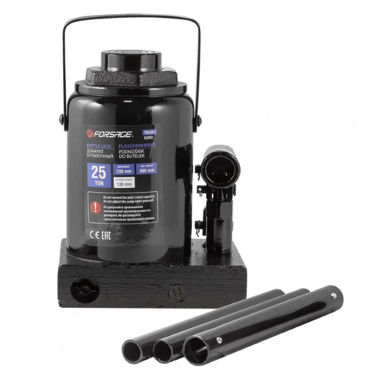Домкрат пляшковий Forsage F-T92507 вантажопідйомністю 25 тонн. Цей незамінний інструмент призначений для безпечного та ефективного підйому важких автомобілів, вантажівок і іншої великогабаритної техніки. Він ідеально підходить як для професійних автосервісів, так і для приватних гаражів, де потрібна максимальна потужність і надійність. Цей низькопрофільний гідравлічний домкрат вирізняється продуманою конструкцією, що забезпечує зручність і безпеку у використанні. Переваги: Вантажопідйомність: 25 тонн – дозволяє працювати з надзвичайно важкими об’єктами. Тип: Пляшковий, гідравлічний – компактний, але дуже потужний. Висота підхоплення: 230 мм – низький профіль забезпечує можливість використання з широким спектром автомобілів, включно з тими, що мають невеликий дорожній просвіт. Максимальна висота підйому: 360 мм – достатня висота для виконання більшості ремонтних та профілактичних робіт. Хід штока: 135 мм – забезпечує оптимальний діапазон для підйому. Висока вантажопідйомність: Здатність підіймати до 25 тонн робить його одним із найпотужніших домкратів у своєму класі, незамінним для роботи з комерційним транспортом і спецтехнікою. Безпечна експлуатація: Оснащений вбудованим запобіжним клапаном, який ефективно запобігає перевантаженню домкрата, захищаючи як інструмент, так і підійманий об’єкт від пошкоджень. Низькопрофільна конструкція: Мінімальна висота підхоплення 230 мм дозволяє легко розміщувати домкрат під автомобілями з низьким кліренсом, розширюючи сферу його застосування. Надійність і довговічність: Виготовлений із якісних матеріалів, цей гідравлічний домкрат розрахований на тривалий термін служби та інтенсивне використання в складних умовах. Простота використання: Інтуїтивно зрозуміла конструкція забезпечує легкість у роботі навіть для користувачів без значного досвіду.