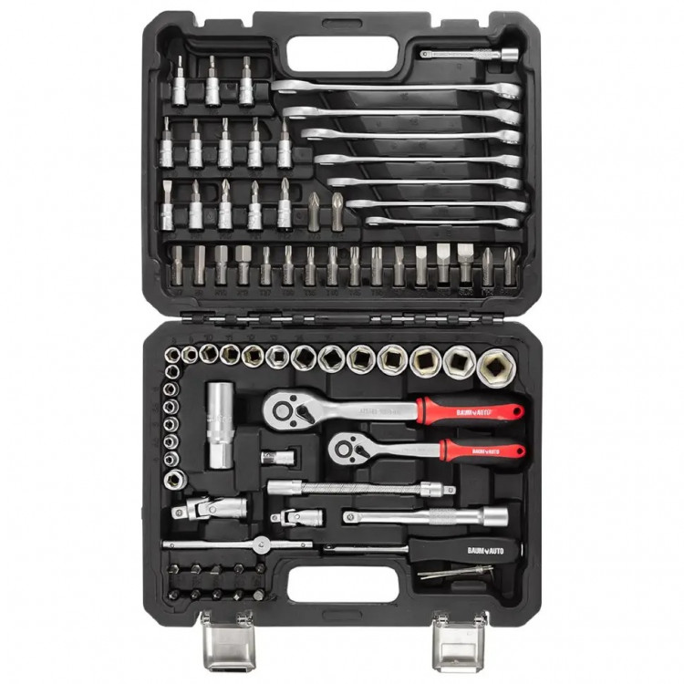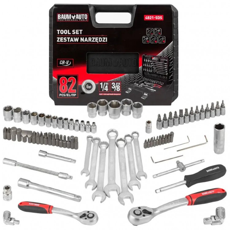 Набір інструментів від бренду BaumAuto BM-4821-5DS — це відмінний вибір для тих, хто цінує якість та професіоналізм. Складений з 82 предметів, цей набір стане незамінним помічником як у гаражі, так і вдома, на дачі або в дорозі. Особливості набору: Широка функціональність: призначений для роботи з звичайним кріпленням, а також з гайками та болтами, у яких пошкоджена зовнішня поверхня. Універсальне застосування: ідеальний для автомобільної та промислової галузей, а також для ремонту та будівництва. Комплектація: Посадковий квадрат 1/4": - Головки: 4, 4.5, 5, 5.5, 6, 7, 8, 9, 10, 11, 12, 13 мм - Бітотримач: 1/4(F)×1/4(M) - Головки біт: H: 3, 4, 5; T: 10, 15, 20; SL: 4, 5.5, 7; PH: 1, 2; PZ: 1, 2 - Біти: SL: 3, 4, 6; PH: 1, 2, 3; PZ: 1, 2 - Адаптер під шуруповерт - Ручка для головок - Тріщотка реверсивна - Т-подібний вороток - Гнучке подовження - Карданний шарнір - Подовжувач L-75 мм Посадковий квадрат 3/8": - Головки: 14, 15, 16, 17, 18, 19, 22 мм - Біти 5/16": H: 7, 8, 10, 12; T: 27, 30, 35, 40, 45, 50; SL: 7, 8, 10, 12; PH: 3, 4; PZ: 3, 4 - Свічна головка 16 мм - Тріщотка реверсивна - Карданний шарнір - Подовжувач L-125 мм - Бітотримач: 3/8(F) - 5/16(M) - Г-подібні шестигранні ключі: 1.5, 2, 2.5 мм - Комбіновані ключі: 8, 10, 11, 12, 13, 14, 15 мм