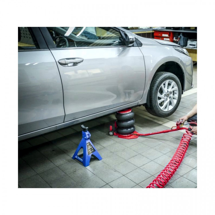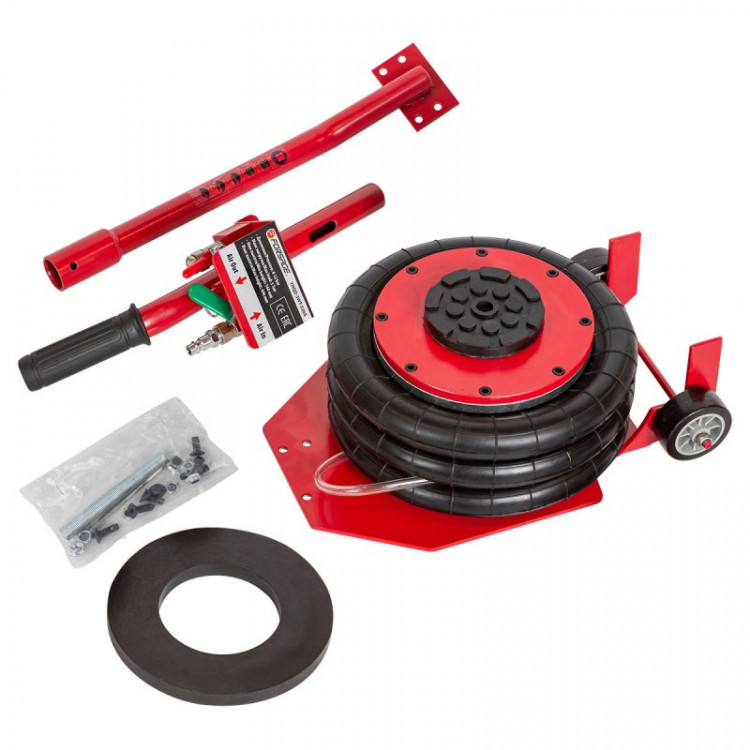 Домкрат підкатний пневматичний 5т(6-12bar, h min 144мм, h max 440мм, 3 подушки, Ø320мм) Forsage F-YHQD-3WT-320A Пневматичний домкрат для швидкої та безпечної заміни колеса Домкрат пневматичний підкатний 5т Forsage F-YHQD-3WT-320A - це надійний і безпечний інструмент, призначений для роботи з автомобілями. Він має такі переваги:Висока вантажопідйомність: Домкрат здатний підняти вантаж масою до 5 тонн, що дозволяє використовувати його для роботи з автомобілями та іншою технікою.Широкий діапазон висот підйому: Домкрат дозволяє піднімати вантаж на висоту від 144 до 440 мм, що дозволяє працювати з автомобілями різної висоти.Зручна конструкція: Домкрат має два колеса та складану ручку, що забезпечує його зручність у використанні та транспортуванні.Безпека: Домкрат оснащений двома клапанами, що запобігають мимовільному опусканню вантажу. Домкрат пневматичний підкатний 5т Forsage F-YHQD-3WT-320A використовується в автосервісах, на станціях техобслуговування та в побуті. Він підходить для наступних робіт:Підйом автомобілівРемонт автомобілівТехнічне обслуговування автомобілів Технічні характеристикиМаксимальна вантажопідйомність: 5 тРобочий тиск: 6-12 барВисота підйому: 144-440 ммДіаметр подушки: 320 ммКількість подушок: 3 Купуйте домкрат підкатний пневматичний 5т Forsage F-YHQD-3WT-320A та переконайтеся в його надійності та безпеці!