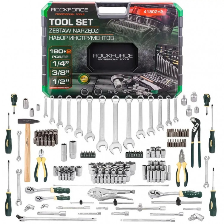 Набір інструментів Rockforce RF-41802+2 (180+2 предмети) — це універсальний професійний комплект з посадочними квадратами 1/4", 3/8" та 1/2", призначений для широкого спектра слюсарних, монтажних та ремонтних робіт. Усі елементи виготовлені з міцних зносостійких матеріалів та зручно розміщені у надійному кейсі. Відмінність від стандартного набора на 180 предметів На відміну від типових 180‑наборів, у цьому комплекті є спеціальні головки для маслосливних пробок 1/2" розміром 8 мм і 10 мм. Три посадочні квадрати (1/4", 3/8", 1/2") дозволяють виконувати як точні роботи з дрібним кріпленням, так і силовий монтаж великих з’єднань. Розширений набір головок — у комплекті представлені 6‑гранні, 12‑гранні, подовжені, свічкові та головки E‑профілю для стандартного та спеціального кріплення. Повний комплект приводних аксесуарів — тріскачки з реверсом, Т‑подібні та шарнірні воротки, подовжувачі й карданні шарніри забезпечують зручну роботу навіть у важкодоступних місцях. Розширений ручний інструмент — викрутки, комбіновані та розрізні ключі, плоскогубці, бокорізи, переставні пасатижі, молоток і гейферний затискач дозволяють виконувати широкий спектр слюсарних операцій. Набір біт і перехідників — 62 біти різних форматів (1/4", 5/16", 3/8") охоплюють усі популярні типи шліців: HEX, SL, PH, PZ, TORX, MN, TH, M. Перехідники та бітотримачі забезпечують максимальну сумісність із різними інструментами і дрилями/шуруповертами. Додаткові зручності — телескопічний магніт (127–635 мм) допоможе дістати дрібні металеві елементи з важкодоступних місць, а міцний кейс гарантує зручне зберігання та транспортування. Комплектація: Посадковий квадрат 1/4"- Головки 6‑гранні: 9 шт. (4, 4.5, 5, 5.5, 6, 7, 8, 9, 10 мм);- Головки подовжені 6‑гранні: 5 шт. (6, 8, 10, 12, 13 мм);- Головки Е‑профіль: 5 шт. (E4, E5, E6, E7, E8);- Тріскачка реверсивна 150 мм;- Вороток Т‑образний 115 мм;- Карданний шарнір;- Бітотримач 1/4"(Sq.F) × 1/4"(Hex.F);- Подовжувач гнучкий 150 мм;- Подовжувачі: 50, 75, 100 мм. Посадковий квадрат 3/8"- Головки 12‑гранні: 6 шт. (10, 11, 12, 13, 14, 15 мм);- Головки подовжені 6‑гранні: 7 шт. (8, 9, 10, 11, 12, 13, 14 мм);- Головки Е‑профіль: 4 шт. (E10, E11, E12, E14);- Тріскачка реверсивна 200 мм;- Карданний шарнір;- Вороток Т‑образний 160 мм;- Подовжувачі: 75, 150, 250 мм;- Адаптер з отвором 1/2"(Sq.F) × 3/8"(Sq.M);- Перехідник 3/8"(Sq.F) × 1/4"(Sq.M);- Бітотримач 3/8"(Sq.F) × 5/16"(Hex.F). Посадковий квадрат 1/2"- Головки 6‑гранні: 17 шт. (8, 9, 10, 11, 12, 13, 14, 15, 16, 17, 18, 19, 22, 24, 27, 30, 32 мм);- Головки подовжені 6‑гранні: 3 шт. (17, 19, 22 мм);- Головки для маслосливних пробок: 2 шт. (8 мм, 10 мм);- Головки Е‑профіль: 5 шт. (E16, E18, E20, E22, E24);- Тріскачка реверсивна 250 мм;- Карданний шарнір;- Вороток Т‑образний 250 мм;- Головки свічкові: 2 шт. (16 мм, 21 мм);- Вороток шарнірний 430 мм;- Подовжувачі: 125, 250 мм;- Адаптер 3/8"(Sq.F) × 1/2"(Sq.M);- Бітотримач 1/2"(Sq.F) × 3/8"(Hex.F). Інші компоненти- Ключі комбіновані 14 шт. (8–24 мм);- Ключі розрізні 3 шт.;- Викрутки 6 шт.;- Плоскогубці комбіновані 175 мм;- Бокорізи 150 мм;- Пасатижі переставні 250 мм;- Зажим гейферний 225 мм;- Молоток 300 г;- Біти 1/4" × 25 мм — 13 шт.;- Біти 5/16" × 30 мм — 17 шт.;- Біти 3/8" × 30 мм — 32 шт.;- Магніт телескопічний 127–635 мм;- Кейс.