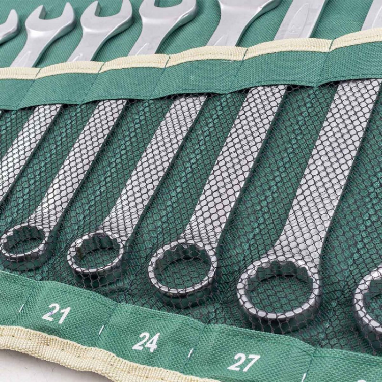 Представляємо набір комбінованих ключів ROCKFORCE RF-5141P, що складається з 14 інструментів розміром від 10 до 32 мм. Ці ключі, виконані зі сталі CrV з покриттям «матовий хром», призначені для монтажу та демонтажу гайкових та болтових з'єднань. Набір включає ключі найбільш затребуваних розмірів, що дозволяє вирішувати широкий спектр завдань як вдома, так і в майстерні чи гаражі. Переваги: Висока міцність: Ключі виготовлені з міцної хромованадієвої сталі (CrV), що гарантує їхню стійкість до деформації навіть при високих навантаженнях. Захист від корозії: Матове хромове покриття надійно захищає інструменти від корозії, забезпечуючи їхній довговічний вигляд та функціональність. Акуратна робота: Накидні частини з 12-гранним профілем охоплюють всю поверхню кріплення, зменшуючи ризик деформації його граней і забезпечуючи безпечну роботу. Комфортна робота в обмеженому просторі: Кут нахилу кільцевих зім (накидних частин) щодо площини інструментів становить 15°, що робить монтаж кріплення зручнішим, особливо у важкодоступних місцях. Зручне зберігання та транспортування: Набір поставляється в зручному тканинному чохлі, де кожен ключ розміщений в індивідуальній кишеньці. Це запобігає їх втраті під час зберігання та транспортування.Комплектація: 10, 12, 13, 14, 15, 16, 17, 18, 19, 21, 24, 27, 30, 32 мм.