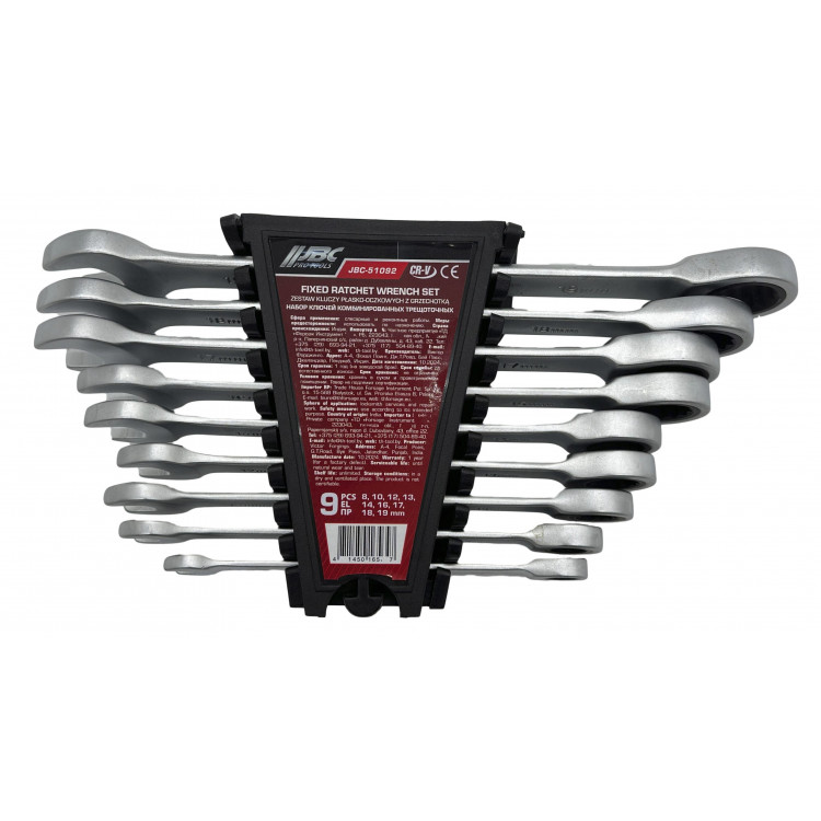 Набір комбінованих ключів JBC-51092 містить 9 предметів та є універсальним інструментом, що поєднує в собі рожкову та накидну частини з тріщотковим механізмом. Ці ключі ідеально підходять для монтажу болтів і гайок із шестигранним профілем, що робить їх незамінними під час ремонту автомобілів, мотоциклів, а також під час збирання станків та виконання інших механічних робіт. Комбінований дизайн. Рожкова частина дозволяє працювати у вузьких місцях, де навколо гайки достатньо простору, а накидна частина з тріщоткою підвищує швидкість роботи. Розміри ключів: 8, 10, 12, 13, 14, 16, 17, 18, 19 мм. 12-гранний профіль накидної частини. Збільшує площу зіткнення робочих поверхонь, знижуючи ризик деформації граней кріплення під час монтажу. Високоякісний матеріал. Ключі виготовлені з хромованадієвої сталі, що гарантує міцність і надійність. Стійкість до корозії. Глянцева полірована хромована поверхня легко очищується та не піддається корозії. Широка сфера застосування. Підходять для використання в ремонті авто- та мототехніки, у будівельній та промисловій сферах, на виробництві та в домашньому господарстві. Зручність зберігання. Набір постачається в компактному пластиковому тримачі, з якого легко діставати потрібний інструмент.