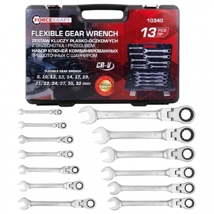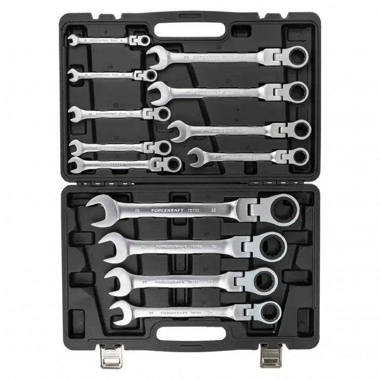 Набір ключів FK-10340 - універсальні гайкові ключі, що поєднують в собі функціонал і переваги ріжкових і накидних ключів. Ключі гайкові з відкритим та кільцевим зівами призначені для монтажу або демонтажу різьбових з'єднань. Набір виготовлений із високоякісної сталі Cr-V. Завдяки тріскачковому механізму та шарніру в накидній частині ключа, ключі можуть нахилятися та повертатися щодо рукоятки, що полегшує доступ до гайок та болтів в обмежених просторах. Комплектація: - Ключі: 8, 10, 12, 13, 14, 17, 19, 21, 22, 24, 27, 30, 32 мм. - Міцний пластиковий кейс.