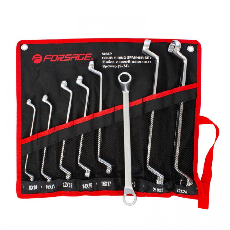 Набір гайкових ключів накидних відкинутих Forsage F-5088P. НабірКлючі:- 8х10 мм- 10х11 мм- 12х13 мм- 14х15 мм- 16х17 мм- 18х19 мм- 21х23 мм- 22х24 мм- Полотно тримачОсобливості- Конструкція: Накидні, відкинуті- Кут: 75 гр. - Двосторонній- Полотно тримач для зручності