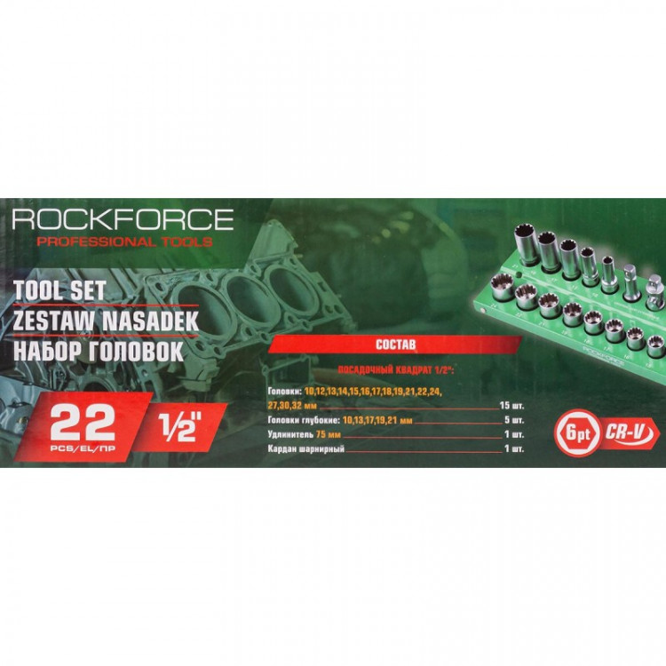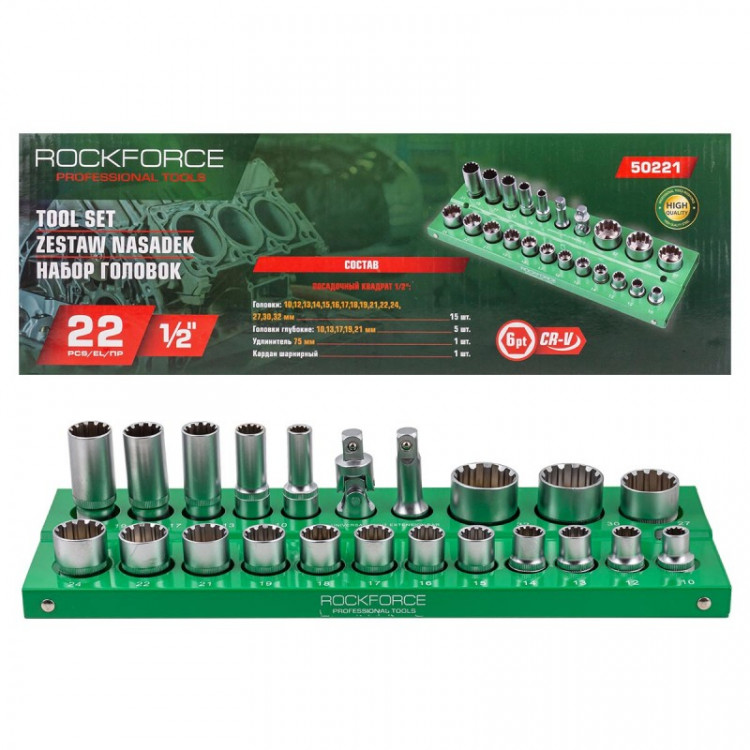 Набір універсальних (Spline) головок ROCKFORCE RF-50221 - це універсальний інструмент, який стане у нагоді як професіоналам, так і домашнім майстрам. Він складається з 22 предметів, включаючи:Головки універсальні (Spline) короткі: 10, 12, 13, 14, 15, 16, 17, 18, 19, 21, 22, 24, 27, 30, 32 мм (15 шт.)Головки універсальні (Spline) глибокі: 10, 13, 17, 19, 21 мм (5 шт.)Подовжувач 75 мм: 1 шт.Кардан шарнірний: 1 шт. Характеристики:Тип: Набір універсальних (Spline) головокКількість предметів: 22Привід: 1/2"Матеріал: Хромванадієва сталь Переваги: Виготовлений з високоякісної хромванадієвої сталі, що забезпечує його міцність, довговічність і стійкість до корозії.Широкий діапазон розмірів головок дозволяє виконувати різні завдання.Подовжувач і карданний шарнір розширюють можливості використання набору.Поставляється в зручному пластиковому кейсі для зберігання. Застосування: Набір універсальних (Spline) головок ROCKFORCE RF-50221 ідеально підходить для використання:Механіками: для ремонту та обслуговування автомобілів, мотоциклів, сільськогосподарської техніки та інших механізмів.Електриками: для монтажу та демонтажу електрообладнання.Домашніми майстрами: для виконання різних робіт по дому та в гаражі.