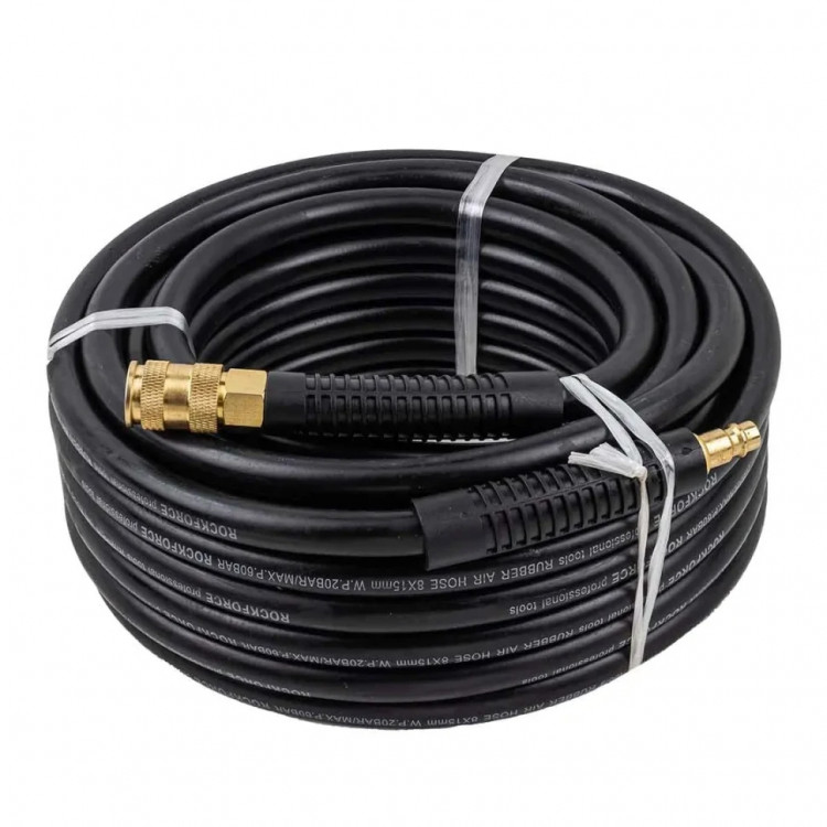 Резиновий армований повітряний шланг з фітингами 8 x 15 мм, довжина 15 метрів, ROCKFORCE RF-AHC-10/F — надійне рішення для підключення пневмоінструменту до компресора та роботи зі стисненим повітрям. Виготовлений з армованої резини з полімерним покриттям, стійким до зносу та багаторазових вигинів, що забезпечує герметичність і довговічність. Шланг високого тиску оснащений сталевими пружинами для захисту від перегинів у місцях кріплення, внутрішній діаметр 8 мм, зовнішній 15 мм, максимальна пропускна здатність — 2000 л/хв. Армування дозволяє витримувати тиск до 60 бар, робочий — 20 бар. Товщина стінки 3,5 мм надає шлангу високу механічну міцність. Фітинги швидкознімні виготовлені з латуні, стійкої до корозії та деформації, з’єднання муфт надійні та довговічні. Посилені місця кріплення запобігають переломам і перегинам. Шланг зберігає експлуатаційні властивості при температурах від -30 до +70 °C. Ідеальний для використання в автосервісах, на будівельних майданчиках та пневматичних системах, де потрібна стабільна подача стисненого повітря.