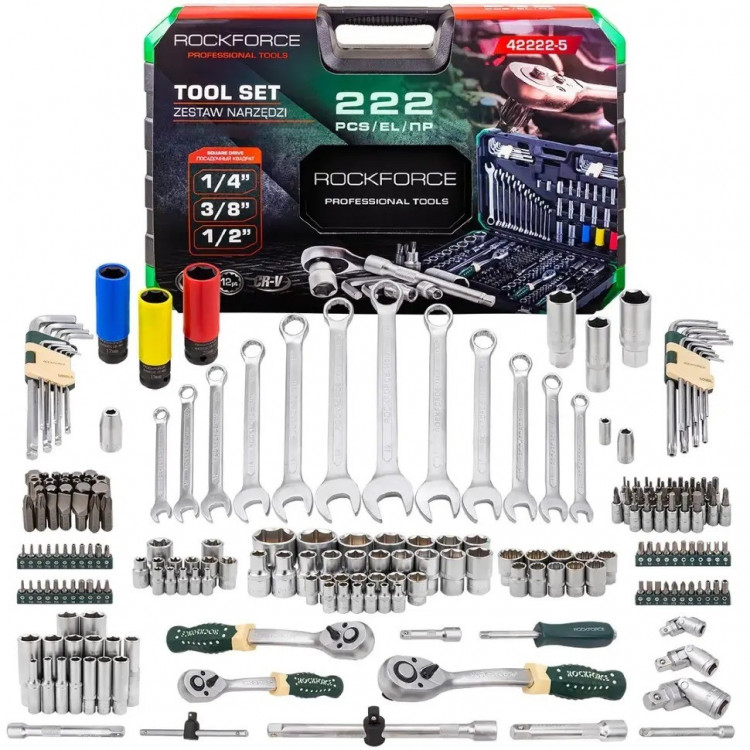 Набір інструментів Rockforce 222 предмета RF-42222-5 — універсальний комплект для автослюсарів, ремонтників, монтажників та домашніх майстрів. Включає три посадочних квадрата (1/4", 3/8", 1/2") та охоплює весь спектр робіт: від точної збірки до силового монтажу. Всі елементи виконані з міцних матеріалів (CRV, CRMO) та зручно розміщені в кейсі. Максимальна універсальність: Три посадочних квадрата — 1/4", 3/8", 1/2" — підходять для роботи з дрібними, середніми та великими кріпленнями. Головки 6-гранні, 12-гранні, глибокі, ударні, свічкові, Е-профіль — повний спектр для будь-яких типів болтів і гайок. Головки-біти та біттримачі забезпечують сумісність з ручним та електроінструментом. Повний приводний набір: Тріскачки з реверсом 72 зуба (150, 200, 250 мм) — плавний хід та зручність у обмеженому просторі. Воротки, подовжувачі, карданні шарніри, адаптери — гнучкість та доступ до важкодоступних вузлів. Розширений ручний інструмент: Комбіновані ключі (12 шт.) та Г-подібні Torx/HEX (18 шт.) — для точної та силової роботи. Викрутки, плоскогубці, пасатижі, молоток, затиск — все необхідне для слюсарних і монтажних операцій. Біти на всі випадки: Понад 100 біт різних форматів та профілів — HEX, SL, PH, PZ, TORX, TW, SP, TQ, TH, MN, S — для будь-яких типів кріплень. Формати 1/4", 5/16", 3/8" — сумісні з різними інструментами та адаптерами. Надійність і якість: Матеріали: CR-V, CRMO — висока міцність, стійкість до зносу та корозії. Міцний кейс — компактне зберігання, захист від пошкоджень та зручність транспортування. Комплектація: Посадковий квадрат 1/4": - Головки 6-гранні 13 шт.: 4, 4.5, 5, 5.5, 6, 7, 8, 9, 10, 11, 12, 13, 14 мм; - Головки глибокі 6-гранні 7 шт.: 4, 5, 6, 7, 8, 9, 10 мм; - Головки Е-профіль 5 шт.: 4, 5, 6, 7, 8 мм; - Тріскачка реверсивна 72 зуба 150 мм; - Вороток Т-подібний 115 мм; - Рукоятка для головок 150 мм; - Шарнір карданний; - Біттримач 1/4"(Sq.F)×1/4"(Hex.F); - Подовжувачі 2 шт.: 50, 100 мм; - Головки-біти 33 шт.: H 3, 4, 5, 6, 7, 8 мм; SL 4, 5.5, 7 мм; PH 1, 2×2, 3; PZ 1, 2, 3; T 8, 9, 10, 15, 20, 25, 27, 30, 40; TH 8, 9, 10, 15, 20, 25, 27, 30; Посадковий квадрат 3/8": - Головки 12-гранні 10 шт.: 10, 11, 12, 13, 14, 15, 16, 17, 18, 19 мм; - Головки глибокі 6-гранні 6 шт.: 10, 11, 12, 13, 14, 15 мм; - Головки Е-профіль 6 шт.: 10, 11, 12, 14, 16, 18 мм; - Тріскачка реверсивна 72 зуба 200 мм; - Головка свічкова 18 мм; - Шарнір карданний; - Біттримач 3/8"(Sq.F)×5/16"(Hex.F); - Подовжувач 125 мм; Посадковий квадрат 1/2": - Головки 6-гранні 17 шт.: 10, 11, 12, 13, 14, 15, 16, 17, 18, 19, 20, 21, 22, 24, 27, 30, 32 мм; - Головки глибокі 6-гранні 2 шт.: 16, 18 мм; - Головки глибокі ударні для литих дисків 3 шт.: 17, 19, 21 мм; - Головки Е-профіль 2 шт.: 20, 24 мм; - Тріскачка реверсивна 72 зуба 250 мм; - Подовжувачі 2 шт.: 125, 250 мм; - Адаптер з отвором 3/8"(Sq.F)×1/2"(Sq.M); - Шарнір карданний; - Біттримач 1/2"(Sq.F)×5/16"(Hex.F); - Головки свічкові 2 шт.: 16, 21 мм; Інші компоненти: - Комбіновані ключі 12 шт.: 8, 9, 10, 11, 12, 14, 15, 16, 17, 18, 19 мм; - Г-подібні Torx 9 шт.: 10, 15, 20, 25, 27, 30, 40, 45, 50; - Г-подібні 6-гранні 9 шт.: 1.5, 2, 2.5, 3, 4, 5, 6, 8, 10 мм; - Біти 1/4"×25 мм 44 шт.: H 3, 4, 5, 6 мм; HH 3, 4, 5, 6 мм; SL 4, 5.5, 6 мм; PH 1, 2, 3; PZ 1, 2, 3; M 5, 6, 8; TQ 6, 8, 10; TW 1, 2, 3; SP 4, 6, 8; TH 8, 10×2, 15×2, 20×2, 25×2, 40; T 8, 10, 15, 20, 25; S 1, 2; - Біти 5/16"×30 мм 24 шт.: H 7, 8, 10, 12, 14 мм; PH 3, 4; PZ 3, 4; SL 8, 10, 12 мм; T 40, 45, 50, 55, 60, 70; TH 40, 45, 50, 55, 60, 70; - Кейс для зберігання всього набору.