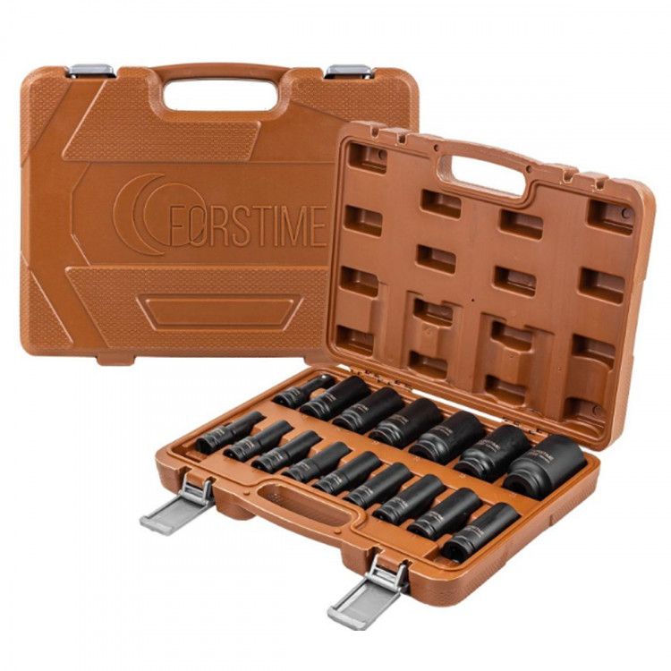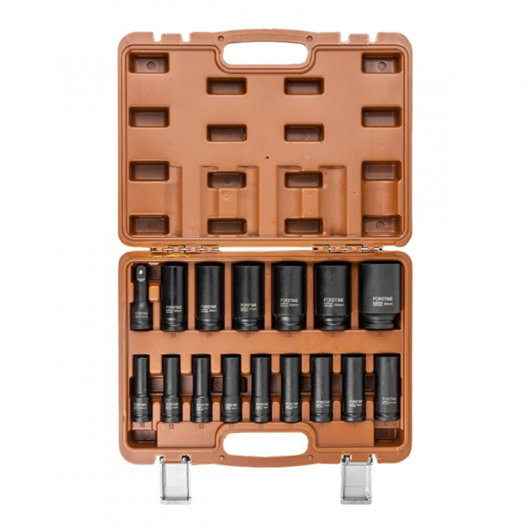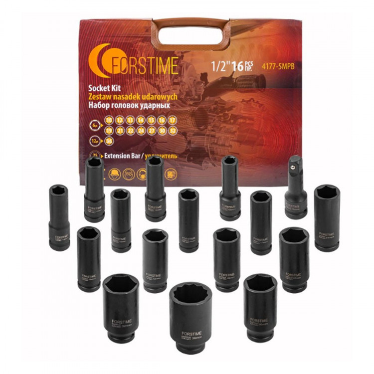 Набір FORSTIME FT-4177-5MPB створений для професійного використання у будівництві та автосервісі. У комплект входять 15 ударних головок розміром від 10 до 36 мм і подовжувач довжиною 75 мм. Головки з приєднувальним квадратом 1/2" виготовлені з хромомолібденової сталі, що забезпечує їхню довговічність і надійність навіть за умов інтенсивного навантаження. Переваги:Подовжений профіль: зручний для роботи у важкодоступних місцях та при монтажі кріплень на шпильках.Зносостійкість: матеріал виготовлення — хромомолібденова сталь.Захист від корозії: матове фосфатне покриття продовжує термін служби.Зручне зберігання: набір постачається у міцному кейсі. Комплектація:Шестигранні головки: 10, 12, 13, 14, 15, 16, 17, 19, 21, 22, 24, 27, 30, 32 ммДванадцятигранна головка: 36 ммПодовжувач: 75 ммКейс Цей набір стане надійним помічником для виконання завдань будь-якої складності!