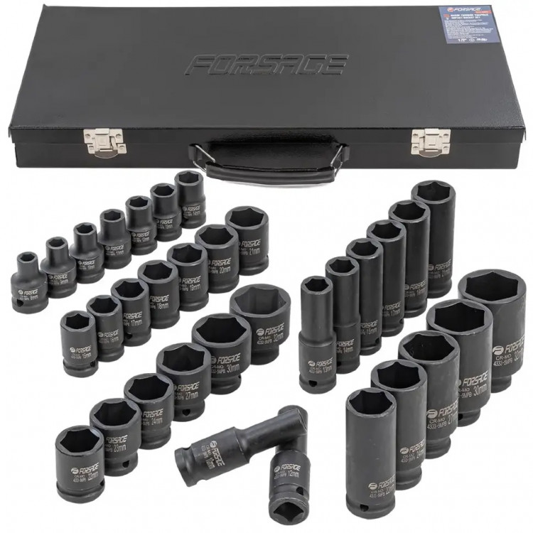 Набір ударних торцевих головок Forsage F-4333-5MPB — надійний професійний інструмент для ремонту автомобілів, мотоциклів, а також для виконання різних механічних і промислових завдань. У комплект входять 33 шестигранні торцеві головки з міцної хроммолібденової сталі, що забезпечує довговічність і надійність під час інтенсивного використання. Короткі ударні головки спеціально розроблені для роботи з ударними гайковертами, гарантуючи ефективну передачу енергії та стійкість при роботі з кріпленням підвищеної міцності. Розміри головок: - короткі 38 мм (8–24 мм, 27 мм, 30 мм, 32 мм) - глибокі 78 мм (10–15 мм, 17 мм, 19 мм, 21 мм, 22 мм, 24 мм, 27 мм, 30 мм, 32 мм). Набір постачається у міцному металевому кейсі для зручного зберігання та транспортування.