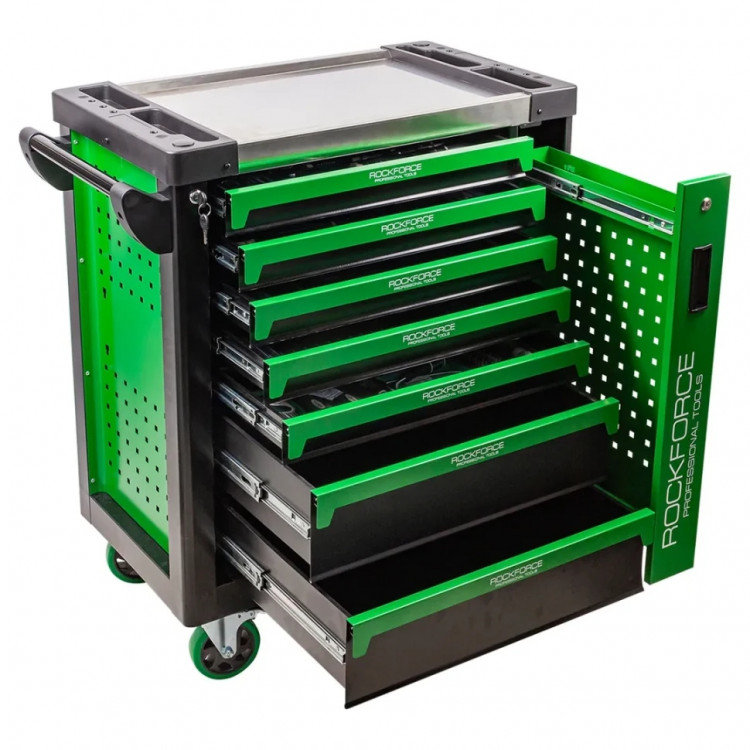 Візок з інструментом від бренду Rockforce RF-55311 — ідеальне рішення для організації вашого робочого простору! Кількість предметів: 274 різних інструмента, що дозволяє виконувати широкий спектр завдань. Матеріал: Виготовлена з якісної сталі, що забезпечує довговічність та надійність. Покриття: Спеціальне захисне покриття запобігає корозії та забезпечує стійкість до миючих засобів і змащувальних речовин. Функціональність: - Сім висувних ящиків для зберігання інструментів. - Бокова секція для ємностей та дрібних приналежностей. - Верхня поверхня з осередками, яка може використовуватися як робочий столик. - Безпека: ящики можна замикати на центральний замок (ключі в комплекті), що забезпечує надійне зберігання інструментів. Комплектація: Головки: - Короткі 1/4": 6, 7, 8, 9, 10, 12, 13, 14 мм - Короткі 1/2": 8, 10, 12, 13, 14, 15, 16, 17, 18, 19, 21, 22, 24, 27, 30, 32 мм - Довгі 1/4": 6, 7, 8, 9, 10, 11, 12, 13, 14 мм - Довгі 1/2": 13, 14, 15, 17, 18, 19, 22, 24 мм - E-профіль 1/4": E6, E7, E8 - E-профіль 1/2": E10, E11, E12, E14, E16, E18, E20, E24 - Свічні 1/2": 16, 21 мм - Свічна 3/8": 14 мм - Ударна глибока E-профіль: E24 3/4" Адаптери та кардан: - Адаптери: 1/2"(F)-3/8”(M), 1/2"(F)-3/4”(M) - Кардан шарнірний: 1/4", 1/2" Подовжувачі: - 1/2": 125 мм, 250 мм - 1/4": 50 мм, 100 мм - Гнучкий подовжувач 150 мм Воротки та тріскачки: - Вороток Т-подібний: 115 мм, 1/4" - Адаптер під вороток: 3/8"DR(F)-1/2”(M) - Тріскачка: 1/4" 150 мм (72 зуба), 1/2" 250 мм (72 зуба) - Вороток шарнірний: 1/2" 450 мм Зйомники: - Зйомник внутрішніх стопорних кілець: вигнутий 90° 185 мм - Зйомник стопорних кілець: прямий на розтиск 180 мм, прямий на стиснення 180 мм, вигнутий на розтиск 180 мм, вигнутий на стиснення 180 мм Ручні інструменти: - Ножиці технічні багатофункціональні: 140 мм - Зажим гейферний: 250 мм - Плоскогубці переставні: 250 мм - Плоскогубці комбіновані: 180 мм - Кусачки прямі: 180 мм - Кусачки бокові: 180 мм - Кусачки торцеві: 200 мм - Пристрій для встановлення стрічкових хомутів ШРУСа: 220 мм Напилки та зубила: - Напилки різнопрофільні: 4 шт. по 200 мм - Зубила: 14 мм (150 мм), 16 мм (175 мм), 20 мм (175 мм) - Викидки: 3, 4, 5 мм (150 мм) - Викидка конусна: 4 мм (120 мм) Свердла та екстрактори: - Свердла по металу: 4, 5, 6, 8, 10 мм - Шпильковерт універсальний: 1/2" (6-19 мм) - Екстрактори різьби: 3-6 мм, 6-8 мм, 8-11 мм, 11-14 мм, 14-18 мм Металеві інструменти: - Щітка по металу (мідь, 260 мм) - Молоток: 0,6 кг Метчики та плашки: - Метчики: М3х0,5, М4х0,7, М5х0,8, М6х1, М8х1,25, М10х1,5, М12х1,75 - Плашки 25 мм: М3х0,5, М4х0,7, М5х0,8, М6х1, М8х1,25, М10х1,5, М12х1,75 - Метчикотримач, плашкотримач Вимірювальні інструменти: - Штангенциркуль: 125 мм, ціна поділу малої шкали 0,02 мм Ключі: - Комбіновані: 8–27 мм - Накидні подовжені: 16х18, 17х19 мм - Накидні: 8–19 мм - Розрізні: 10х12, 11х13 мм - Тріскачкові: 8х10, 12х13 мм - Ріжковий: 32х36 мм - E-профіль: E10хE12, E14хE18, E20хE24 - 6-гранні Г-подібні: 1.5–10 мм - Г-подібні TORX: T10–T50 Відвертки: - Плоскі магнітні: SL5x38, SL6x100, SL6x150 - Хрестові магнітні: PH0x75, PH1x38, PH2x100, PH2x150 - Бітотримач 1/4": 215 мм - Гнучкий магніт: 500 мм - Відвертка індикаторна Біти: - 30 мм: H4–H12, M5–M12, T20–T55 - 75 мм: H4–H12, M5–M12, T20–T55 - Головки-біти 1/2": M14, M16, M18 - Бітотримач: 1/2", 3/8" - Відвертка ударна з адаптером-бітотримачем: 1/2"(F)-5/16”(F) Додаткові біти: - 5/16”: SL5–SL8, PH1–PH4, H6–H7 - 1/4” трипроменева: 6, 8, 10 мм - 1/4” TORG: 1–4 мм - 1/4” SPANNER: 4, 6, 8, 10 мм - 1/4” TORX з отвором: T8–T40 - 1/4” 6-гранні метричні: 2–6 мм - 1/4” 6-гранні дюймові: 5/32”, 9/64”, 1/8”, 7/64”, 3/32”, 5/64” - Магнітний тримач для біт 1/4": довжина 60 мм