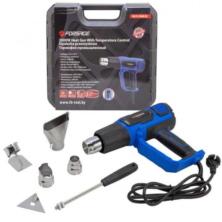 Промисловий електричний фен Forsage F-HG70-2000LED – це потужне та універсальне обладнання, призначене для виконання різноманітних завдань у різноманітних робочих умовах. Цей фен має передові технічні характеристики та широкий насадок, що робить його ідеальним інструментом для широкого спектру професійних робіт.