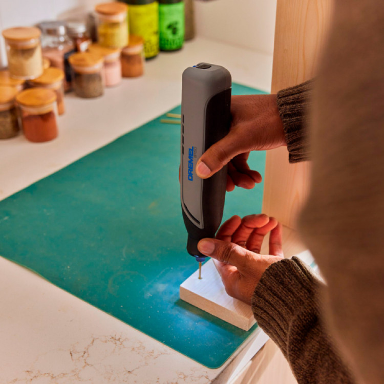 Роторний інструмент для робіт по дому — Dremel 8150-20. Вбудований 7.2 В 2 Ah акумулятор. Безщітковий двигун. Регулювання обертів від 5000 до 30000 об/хв. Компактні розміри (210х45х35 мм) і легка вага (430 г). З практичним футляром і найнеобхіднішими 20 аксесуарами.