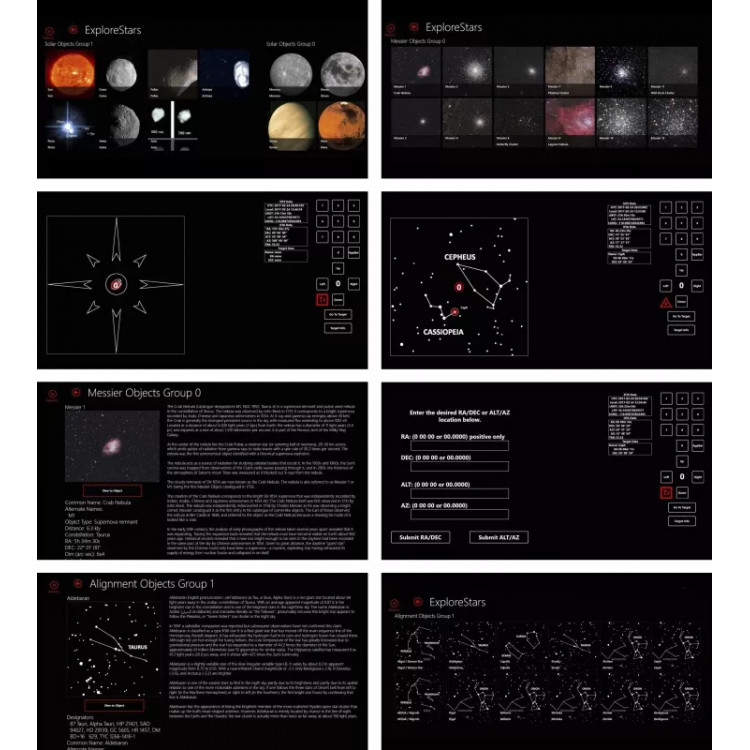 Інтерфейс програмного забезпечення має класичну схему з чотирьох кнопок для керування, центрування, переміщення та повороту на сенсорному екрані вашого планшета чи смартфона. Розгорнуті меню, які пропонують інтуїтивно зрозумілу процедуру вирівнювання, вибір різних каталогів, екскурсії, кнопку синхронізації, положення "паркування", функцію пошуку та екран введення координат для інформації RA та DEC. Цифрове меню дозволяє вибирати та вводити швидкість для повороту, центрування та наведення.