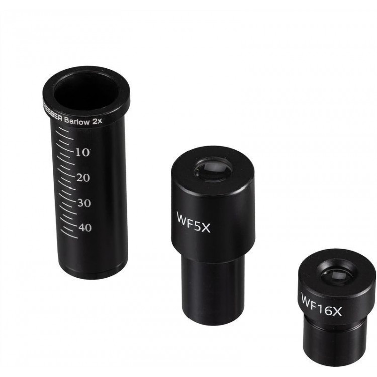 Окуляри 5x і 16x — комплектується двома змінними окулярами — 5x та 16x, які в комбінації з трьома об'єктивами (4x, 10x, 40x) дають різні ступені збільшення в діапазоні від 20x до 1280x. Додатково лінза Barlow Zoom 2x дозволяє безступінчасто збільшувати зображення між фіксованими значеннями, не міняючи окуляр вручну.
