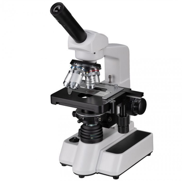 - Чотири ступені збільшення (40x, 100x, 400x, 1000x) — мікроскоп оснащений чотирма об'єктивами: 4x, 10x, 40x та 100x, які у поєднанні з окуляром 10x дають чотири рівні збільшення. Це дозволяє переходити від загального огляду препарату до вивчення найдрібніших клітинних структур. Такий діапазон є оптимальним для навчальних і аматорських досліджень у біології та ботаніці.