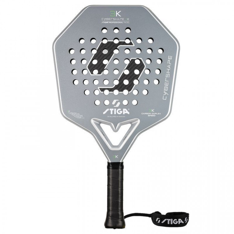 Унікальний шестикутний дизайн Cybershape® справить враження на всіх. Він створений для гравців, яким потрібне високе прискорення та чіткіше відчуття удару м'яча по ракетці. Прямі краї ракетки ідеально збігаються з кортом, що спрощує виконання відмінних ударів ближче до землі. Форма унікальна ще з однієї причини. Дизайн Cybershape забезпечує велику зону найкращого удару, вище на ракетці в порівнянні з традиційними ракетками для падела. Фактично, зона найкращого удару на 20% більша: ви справді не можете її пропустити. Надміцна рама виготовленазі 100% карбонового волокна, яке ми називаємо 360° Carbon Frame. Ударна поверхня виконана зі скручених карбонових волокон, сплетених за технологією 3k twill, що дозволяє створити ракетку зі швидким відгуком та здатністю витримувати дуже потужні удари супротивника. Текстурована поверхня Crystal Grip забезпечує максимальне обертання м'яча та покращує контроль м'яча. Довга ручка зручна для утримання та залишає достатньо місця для захоплення двома руками, що забезпечує більшу гнучкість у грі. Ракетка також оснащена ремінцем на зап'ястя, який легко замінити.