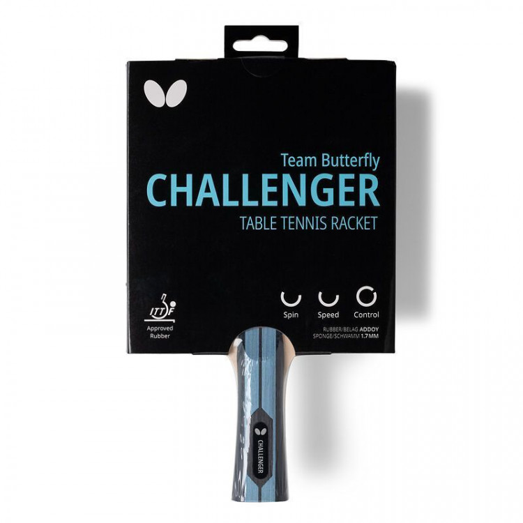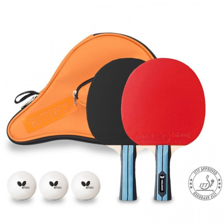 Набір для настільного тенісу складається з 2-х ракеток Team Butterfly Challenger, 3 класичних м'ячів та чохла для 2-х ракеток з відділенням для м'ячів. Ракетка Team Butterfly Challenger характеризується контрольованим характером, але водночас дозволяє виконувати швидкі удари з насиченим обертанням. Вона оснащена гумовими накладками Addoy і товщиною губки 1,7 мм які схвалені ITTF для змагань. Team Butterfly Challenger – ідеальний вибір для початківців та гравців які володіють базовими та основними навичками. Вся серія створена для універсальної гри, оскільки вона дуже поблажлива та має хороший контроль, але між кожною моделлю є невелика різниця щодо швидкості та обертання.