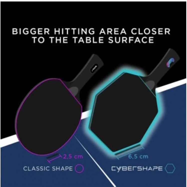 Більша зона удару ближче до поверхні столу — однією з відмінних особливостей конструкції Cybershape є те, що зона удару у поверхні столу збільшена до 6,5 см, у порівнянні з 2,5 см для круглого леза. Це дає вам більше шансів виконати короткі подачі та повернення