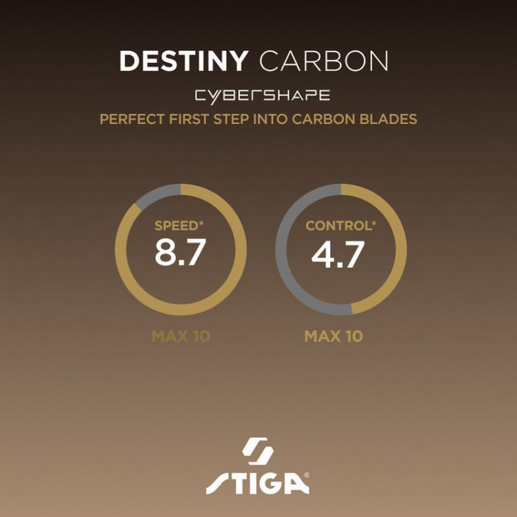 Destiny Carbon Cybershape створена для гравців, які хочуть зробити перехід від класичної дерев’яної основи до карбону, зберігши знайоме відчуття м’яча та високий рівень контролю. Збалансована конструкція та оптимізована зона оптимального удару (sweet spot) дозволяють зберігати потужність, контроль і точність як у грі біля столу на блоці, так і при вирішальних топспінах з дистанції. Destiny Carbon Cybershape робить наступний крок у розвитку атакувальних основ. Поєднання добірної деревини з ультратонким карбоновим волокном (64 г карбону на м²) забезпечує вибухову швидкість, передбачувану траєкторію м’яча та виняткову стабільність. Унікальна структура карбону TeXtreme® Spread Tow з волокнами, орієнтованими під кутом 90 градусів, зберігає відчуття м'яча й контроль. Destiny Carbon Cybershape — ідеальний варіант для першого знайомства з карбоновими основами.