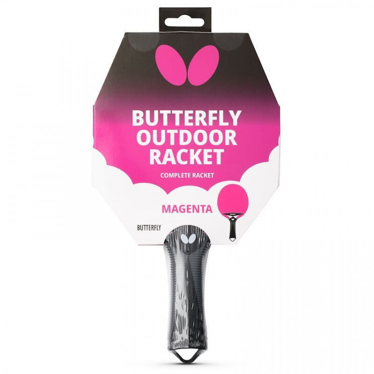 Butterfly Outdoor Racket — ракетка для настільного тенісу, спеціально розроблена для гри на відкритому повітрі в саду, парку або на терасі. Завдяки високій міцності та стійкості до погодних умов вона забезпечує надійну та комфортну гру незалежно від зовнішніх умов. Виразний дизайн у чорному та маджентовому кольорах виділяє ракетку серед інших і додає яскравості кожному матчу. Відмінне співвідношення ціни та якості робить її ідеальним вибором для активного відпочинку на свіжому повітрі.